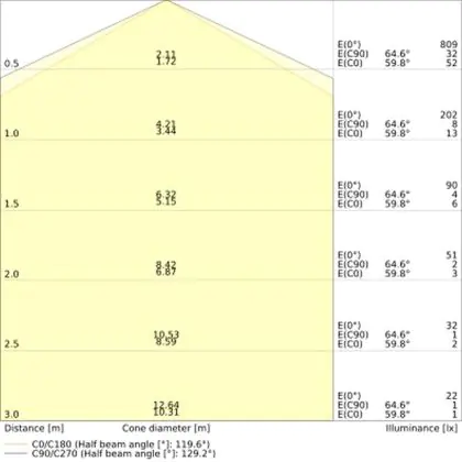 De lichtopbrengst (Lumen), geeft weer hoe krachtig het uitgestraalde licht is. Dit is belangrijk om te weten om de juiste sfeer te creëren. 0 tot 400 Lumen is bij uitstek geschikt voor accent- of sfeerverlichting. Een hoger aantal Lumen is, afhankelijk van de grootte van de ruimte, beter geschikt als ondersteunende- of basisverlichting. Heb je plafonds hoger dan 4 meter, dan is een lichtopbrengst van minimaal 8000lm aan te raden indien heldere verliching gewenst is (vb. in werkomgevingen).