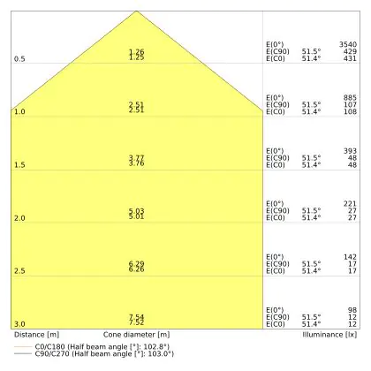 De gradenbundel geeft informatie over hoe breed het licht wordt uitgestraald. Dit zit tussen de 0 en 360 graden (D). Hoe kleiner de hoek, hoe specifieker de lichtbundel is. Over het algemeen is een smalle gradenbundel perfect voor sfeer- of accentverlichting, terwijl een brede gradenbundel ideaal is om grote oppervlaktes te verlichten.