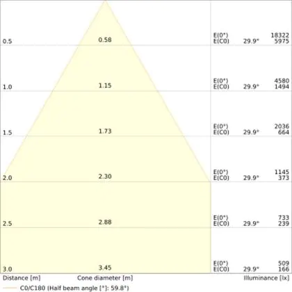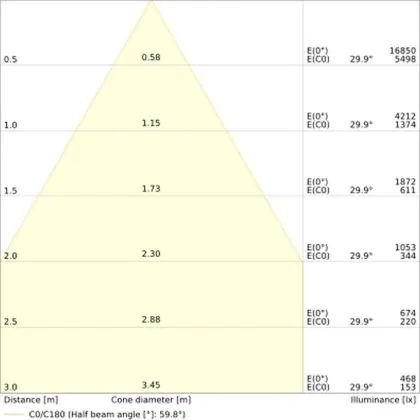 De gradenbundel geeft informatie over hoe breed het licht wordt uitgestraald. Dit zit tussen de 0 en 360 graden (D). Hoe kleiner de hoek, hoe specifieker de lichtbundel is. Over het algemeen is een smalle gradenbundel perfect voor sfeer- of accentverlichting, terwijl een brede gradenbundel ideaal is om grote oppervlaktes te verlichten.