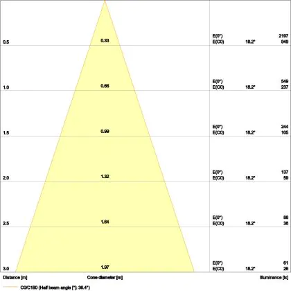 De lichtopbrengst en de gradenbundel spelen een grote rol. Zo geeft de lichtopbrengst van 300 Lumen in combinatie met de 36° stralingshoek deze inbouwspot een specifieke toepassing. Kort samengevat is een lichtintensiteit van maximaal 400 Lumen ideaal voor accentverlichting, terwijl hogere waardes goed gebruikt kunnen worden als basisverlichting. Over het algemeen geldt: hoe breder de gradenbundel, hoe geschikter deze is door basisverlichting. Dit komt doordat het licht over een groter oppervlak wordt verspreid. Smallere gradenbundels (tot 40°) kunnen echter bij hoge plafonds ook goed tot hun recht komen als algemene verlichting.
