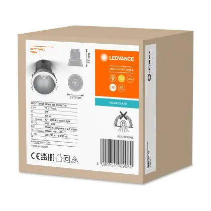Goed om te weten is dat deze LED inbouwspot een zaagmaat heeft van 65mm en een diameter van 70mm. Dit wil zeggen dat het gat in het systeemplafond of het verlaagde plafond een afmeting dient te hebben van 65mm om het armatuur stevig in het plafond te bevestigen. De spot zelf is voorzien van twee handige klemmetjes, die uitzetten zodra het armatuur in de gat is geplaatst. Zo geregeld dus! Vanaf het moment van aanschaf ontvang je 3 jaar all-in garantie. Hierdoor ben je verzekerd dat de inbouwspot ook doet wat die hoort te doen: zonder problemen een ruimte verlichten!