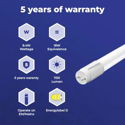 Deze Noxion LED TL buis heeft een Lumen / Watt efficiëntie van lm/W. Dit is de waarde die je verkrijgt door de lichtopbrengst (1150 Lumen) te delen door het wattage (8W) van deze lichtbron. Hoe weet je of jouw lichtbron een goede efficiëntie heeft? In dit geval ligt de lm/W waarde boven de 65. Je kunt er ook voor kiezen om een LED geïntegreerd TL armatuur te kopen. Hierbij heb je de keuze uit diverse (waterdichte) LED montagebalken, die in een divers aantal Lumen verkrijgbaar zijn. Een (dimbaar) LED paneel is ook een slimme optie, met name voor ruimtes met een systeemplafond (eenvoudige installatie) en kantoren (UGR<19 varianten).