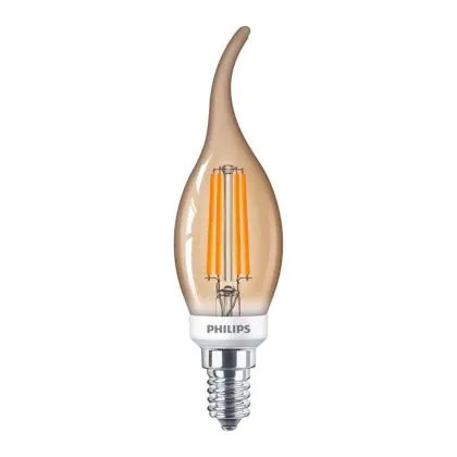 Beschrijving Philips Classic LED Kaars E14 gebogen punt Filament Goud 5W 350lm - 822 Zeer Warm Wit | Dimbaar - Vervangt 40W
